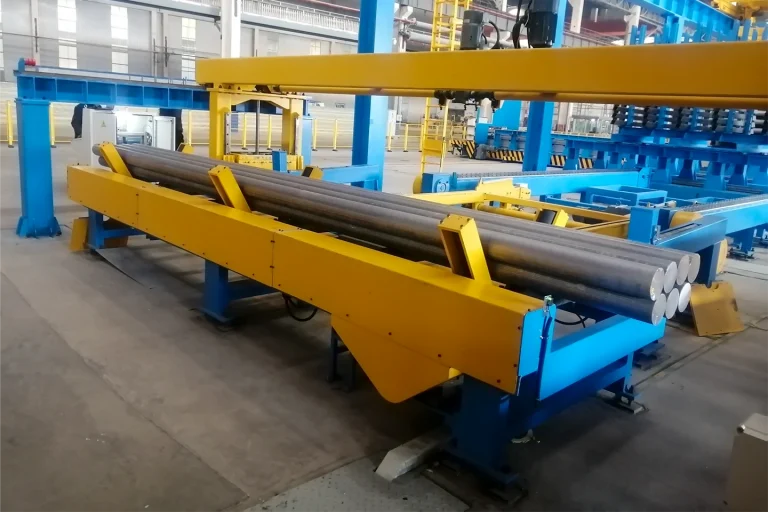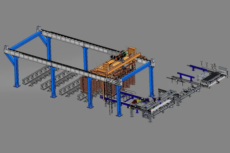 1、 本设备具有自动叠料,卸料,堆捆,打包,称重,打码的功能,而且每个功能可通过上位机触摸屏设定自动运行,并且可与锯切机、料车、均质炉组程序连锁,实现全自动功能;